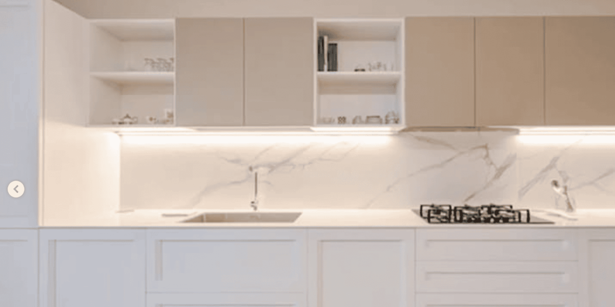 Para este proyecto, nuestro cliente buscaba una cocina moderna, funcional y elegante, que mantuviera la armonía con el estilo luminoso y neutro del resto de la vivienda. Diseñamos un espacio que combina tonos blanco y beige con una superficie marmolada que aporta textura y sofisticación. La iluminación lineal integrada realza las formas limpias del mobiliario y resalta la continuidad de