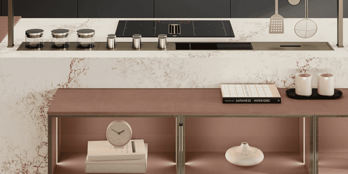 Diseño de cocina moderna con isla marmolada y detalles en rosa metálicoEste proyecto destaca por su equilibrio entre sofisticación contemporánea y delicadeza estética. La isla central en acabado marmolado se convierte en el punto focal del espacio, aportando textura, elegancia y funcionalidad. Los detalles en rosa metálico añaden un toque distintivo y moderno, creando una atmósfera refinada y acogedora. Cada