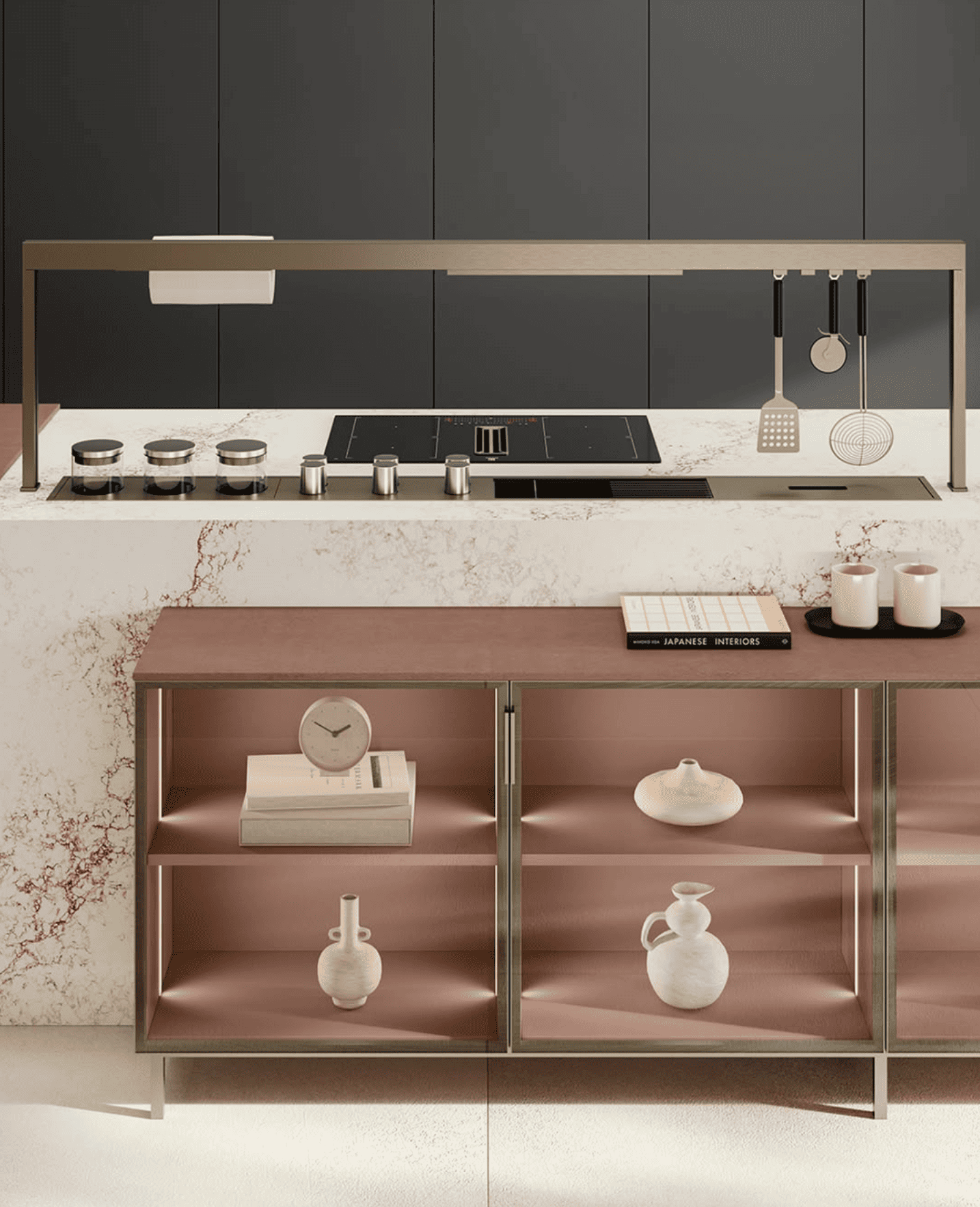 Este proyecto destaca por su equilibrio entre sofisticación contemporánea y delicadeza estética. La isla central en acabado marmolado se convierte en el punto focal del espacio, aportando textura, elegancia y funcionalidad. Los detalles en rosa metálico añaden un toque distintivo y moderno, creando una atmósfera refinada y acogedora.