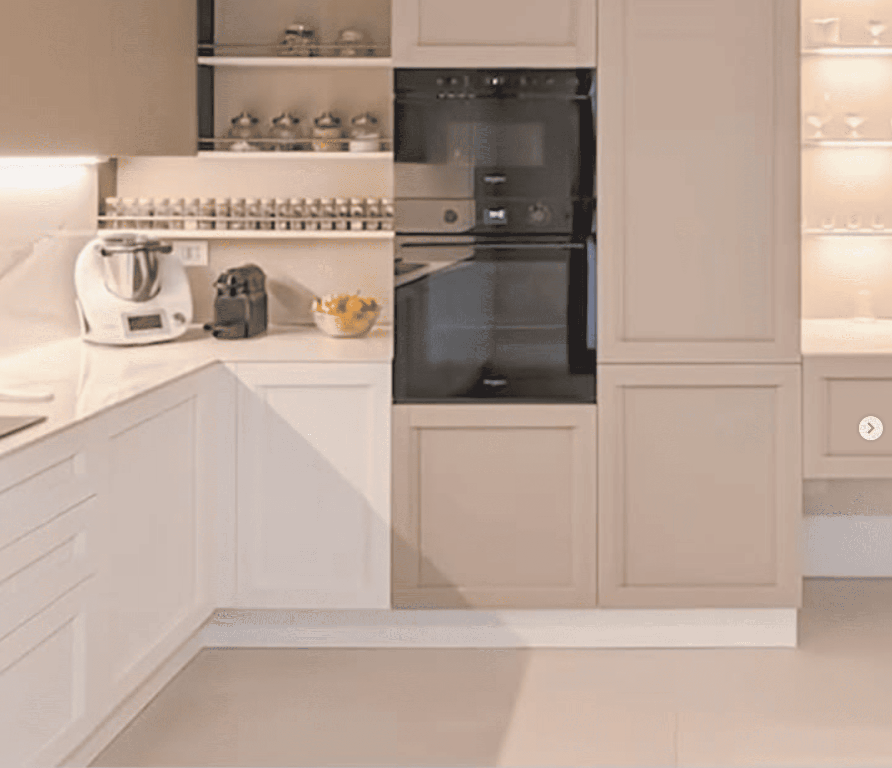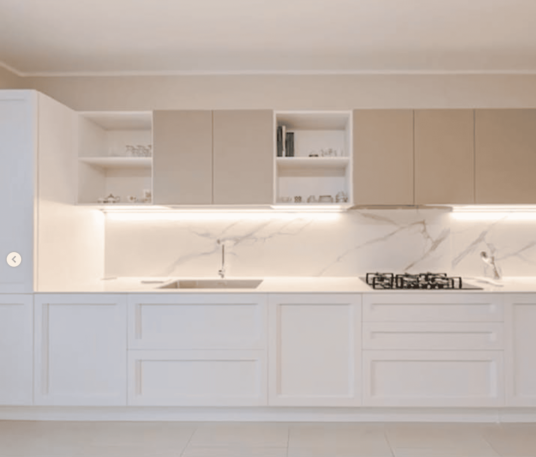 Proyecto de cocina moderna en blanco y beige con acabados marmolados